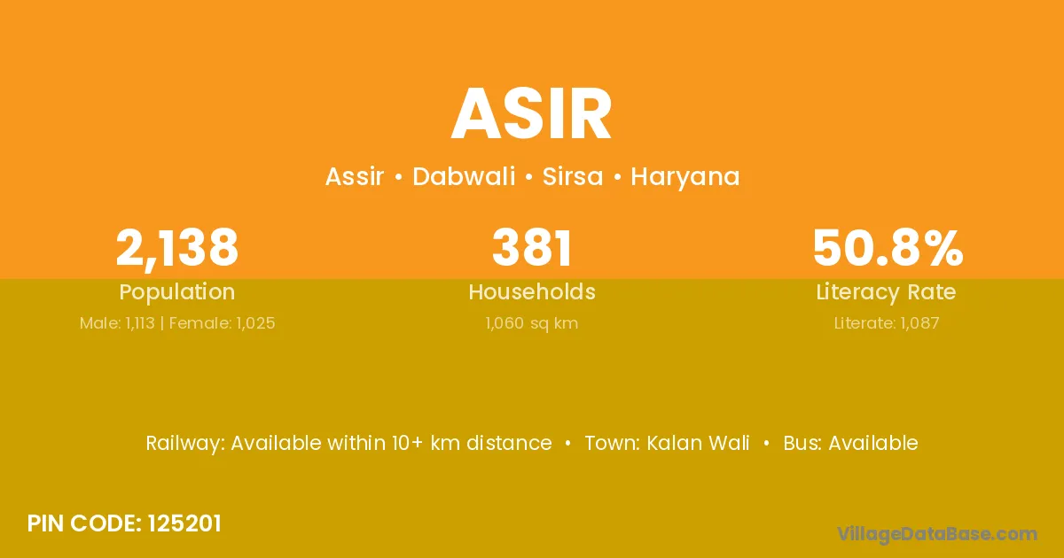 Asir village has a total population of 2,138 people, of which 1,113 are males and 1,025 are females.