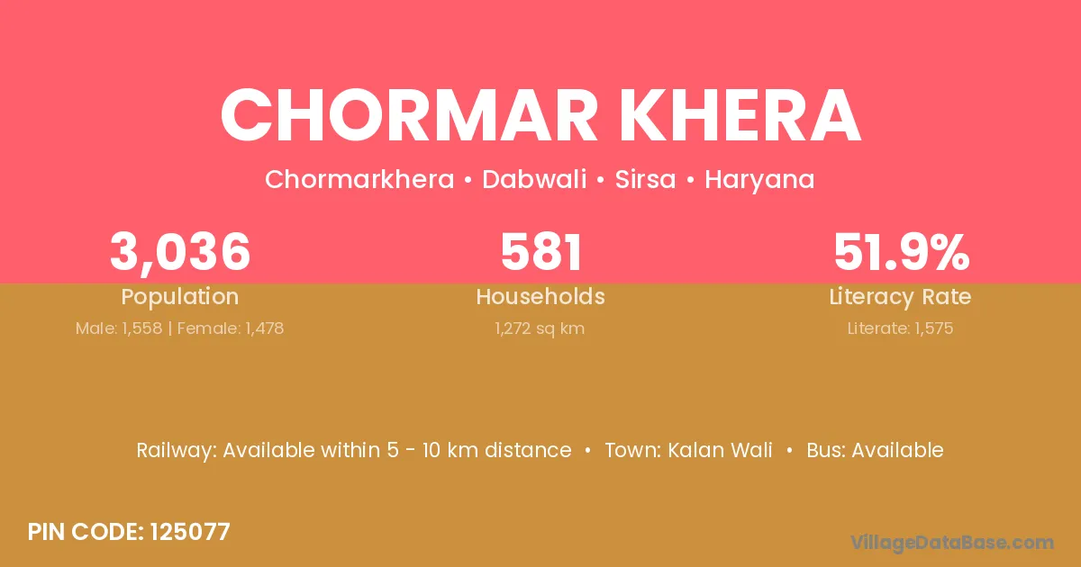 Chormar Khera village has a total population of 3,036 people, of which 1,558 are males and 1,478 are females.