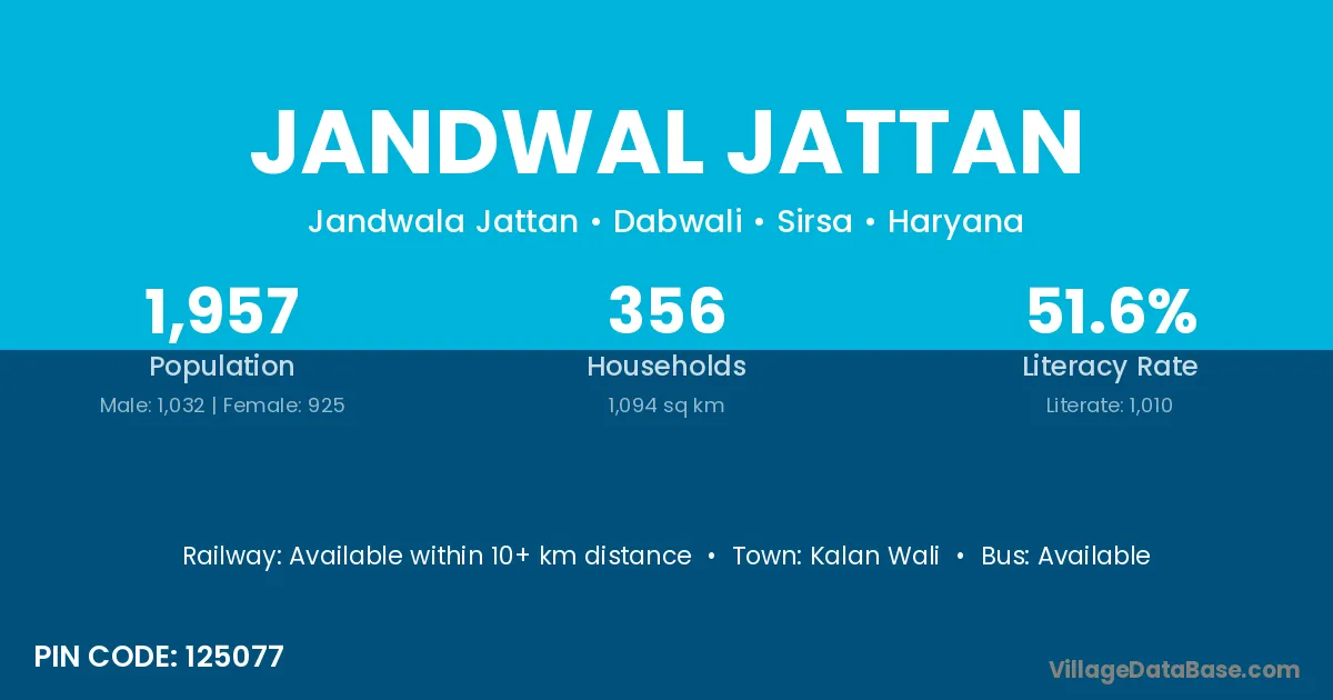 Jandwal Jattan village has a total population of 1,957 people, of which 1,032 are males and 925 are females.