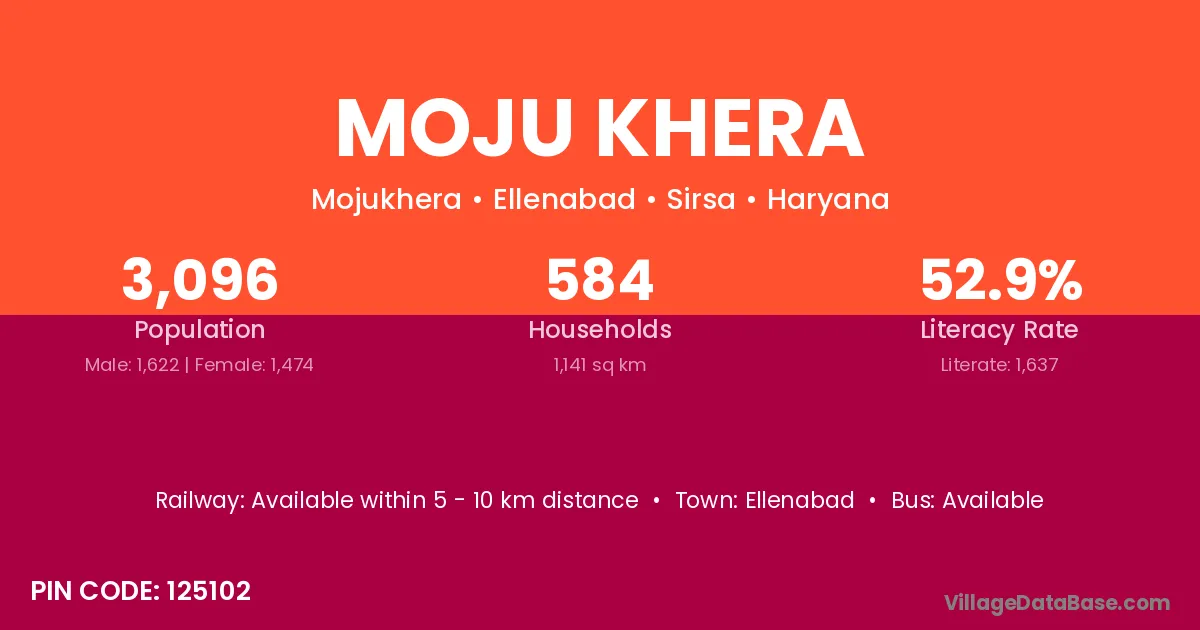 Moju Khera village has a total population of 3,096 people, of which 1,622 are males and 1,474 are females.