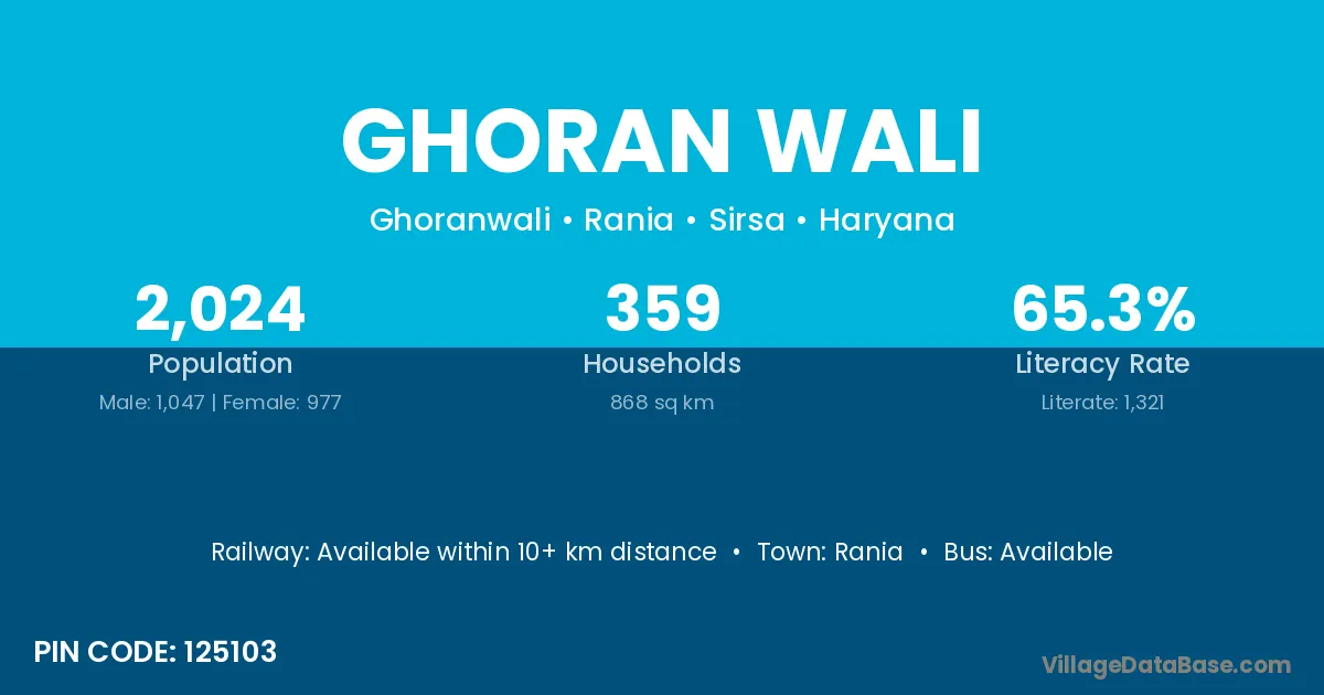 Ghoran Wali village has a total population of 2,024 people, of which 1,047 are males and 977 are females.