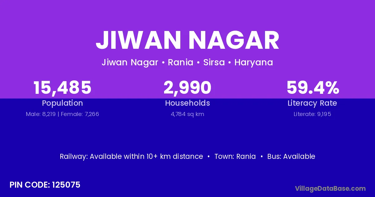 Jiwan Nagar village has a total population of 15,485 people, of which 8,219 are males and 7,266 are females.