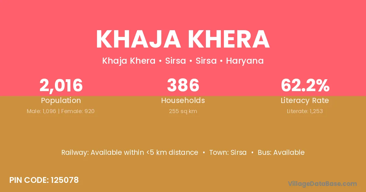The literacy rate of Khaja Khera village is 60.54%. Male literacy stands at 69.44% and female literacy at 50.76%.