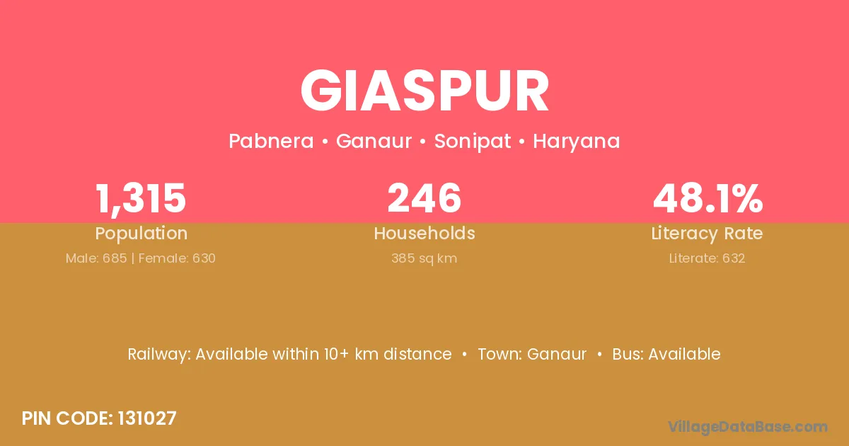 Giaspur village has a total population of 1,315 people, of which 685 are males and 630 are females.