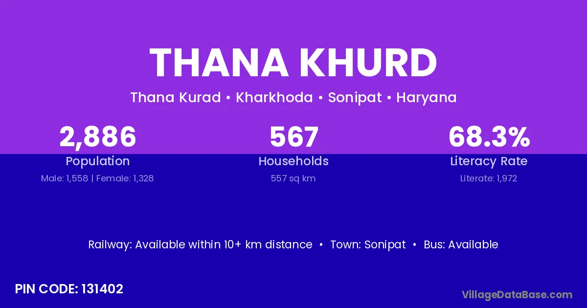 Thana Khurd village has a total population of 2,886 people, of which 1,558 are males and 1,328 are females.