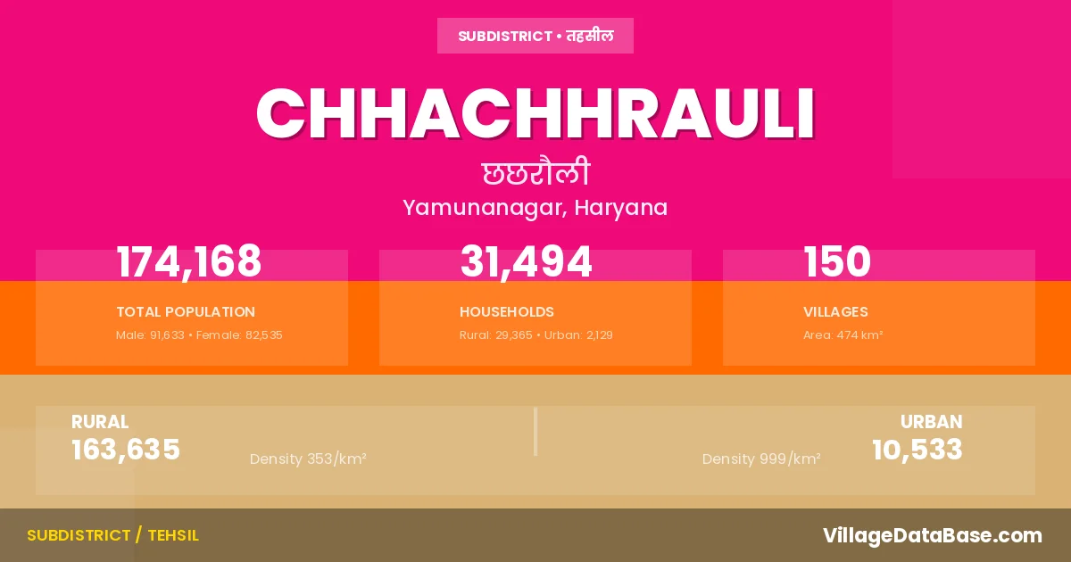 According to the 2011 census The total area of Chhachhrauli Tehsil is 474 km², with a population of 174168 people. The population density is 368 inhabitants per square kilometre, and there are approximately 31494 houses in the sub district.
