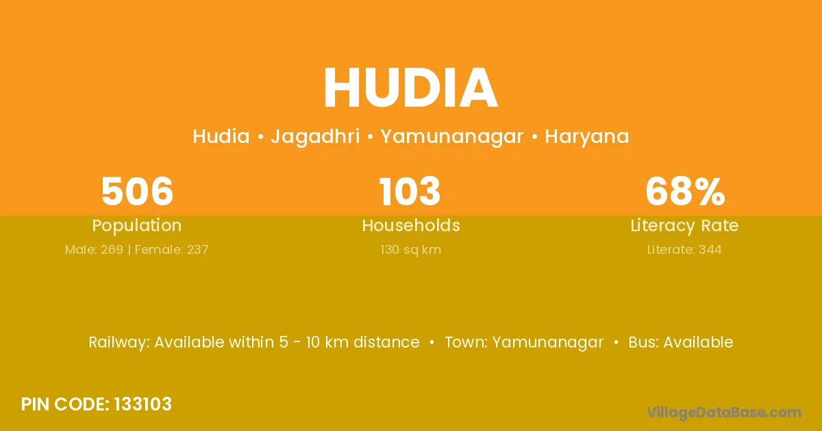 Yamunanagar is the nearest town to Hudia village for major economic activities