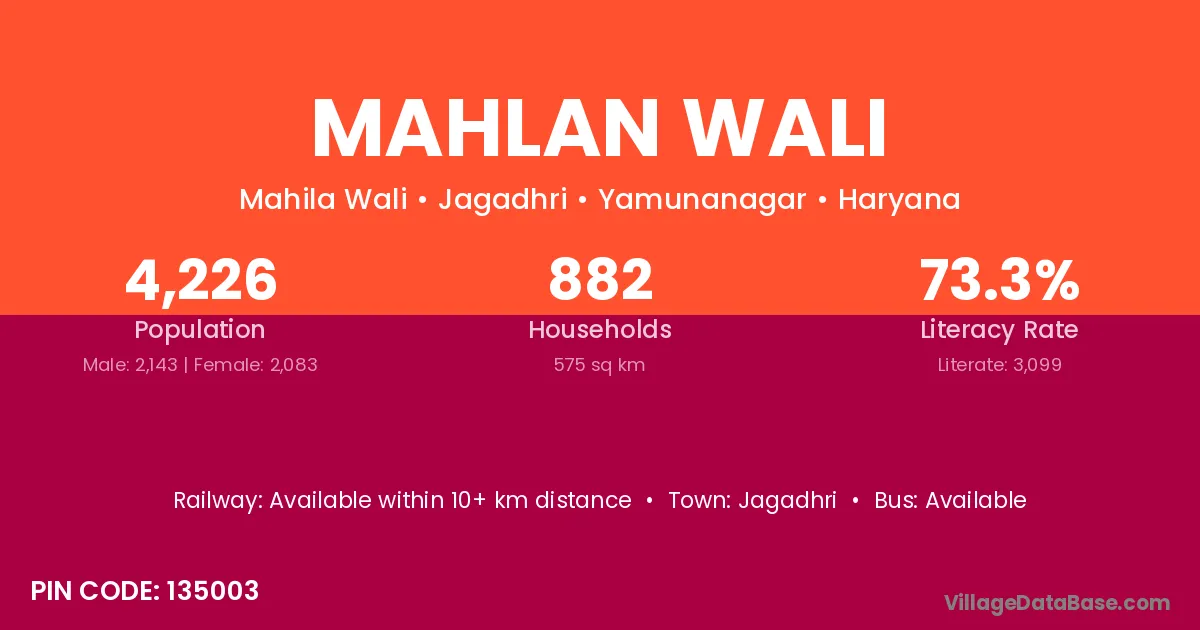 Mahlan Wali village has a total population of 4,226 people, of which 2,143 are males and 2,083 are females.