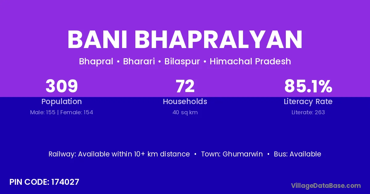 Bani Bhapralyan village has a total population of 309 people, of which 155 are males and 154 are females.