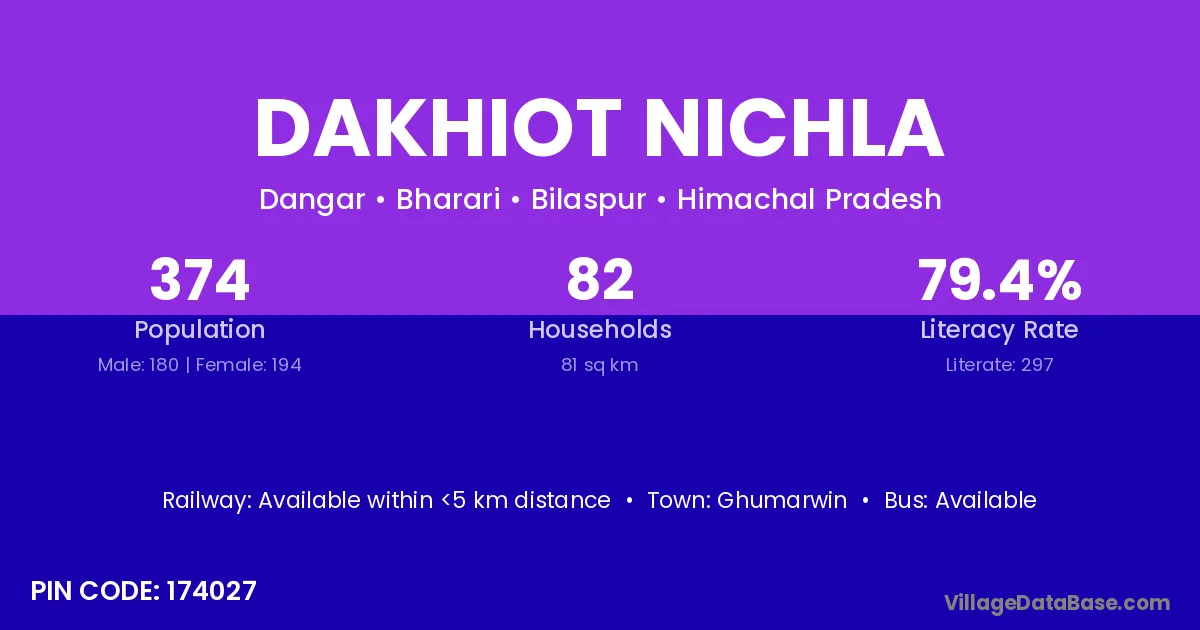 Dakhiot Nichla village has a total population of 374 people, of which 180 are males and 194 are females.
