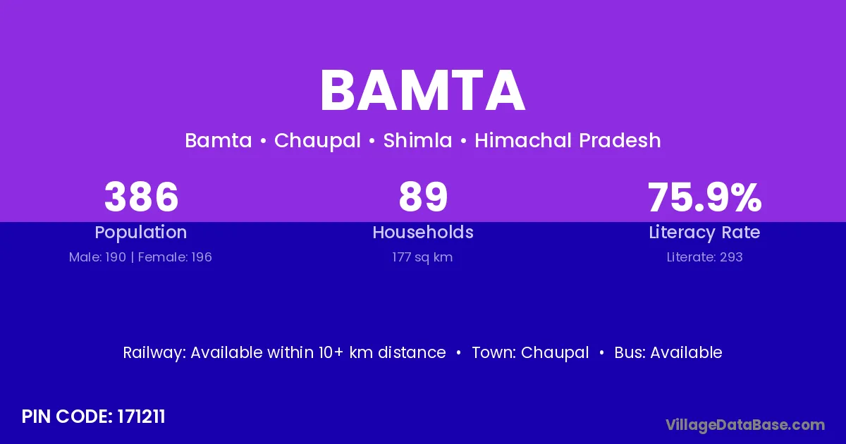 According to Census 2011 information, the village code of Bamta village is 174001.