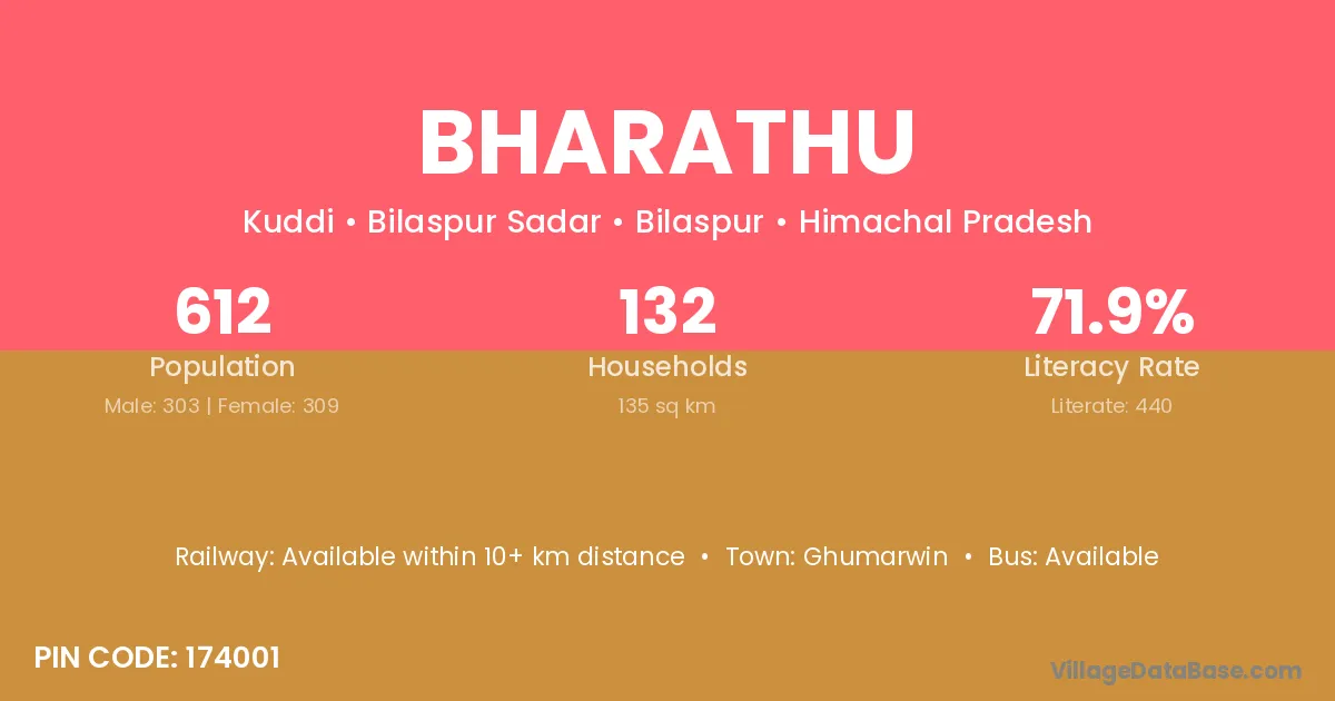 Bharathu village has a total population of 612 people, of which 303 are males and 309 are females.