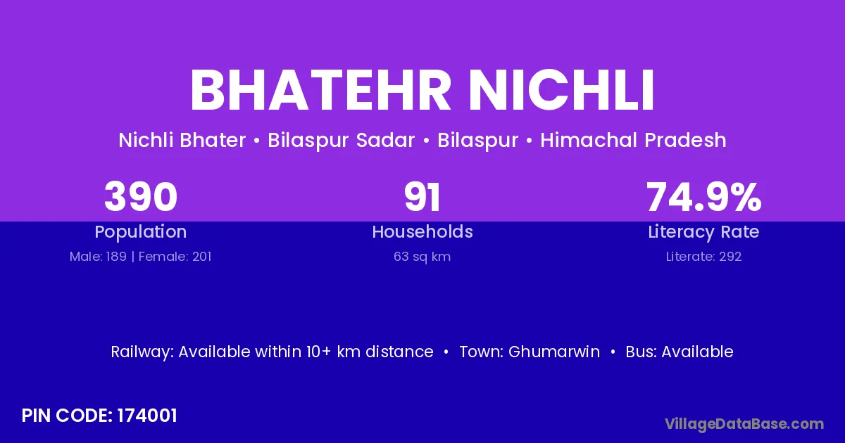 Bhatehr Nichli village has a total population of 390 people, of which 189 are males and 201 are females.
