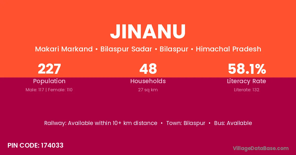 Jinanu village has a total population of 227 people, of which 117 are males and 110 are females.