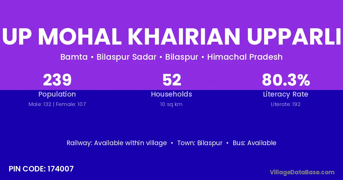 Bilaspur is the nearest town to Up Mohal Khairian Upparli village for major economic activities