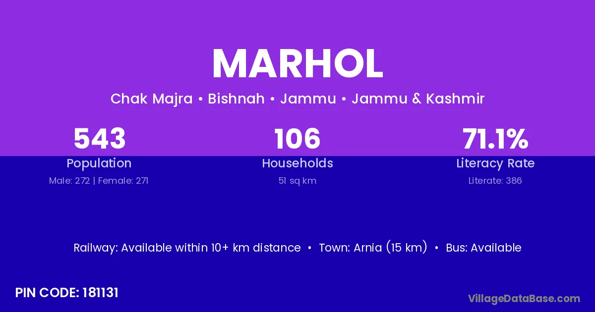 The literacy rate of Marhol village is 81.94%. Male literacy stands at 88.24% and female literacy at 75.00%.