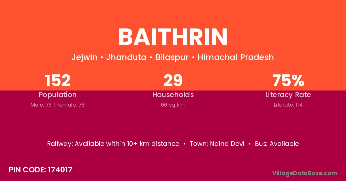 Baithrin village has a total population of 152 people, of which 76 are males and 76 are females.