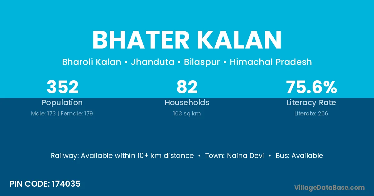 Bhater Kalan village has a total population of 352 people, of which 173 are males and 179 are females.