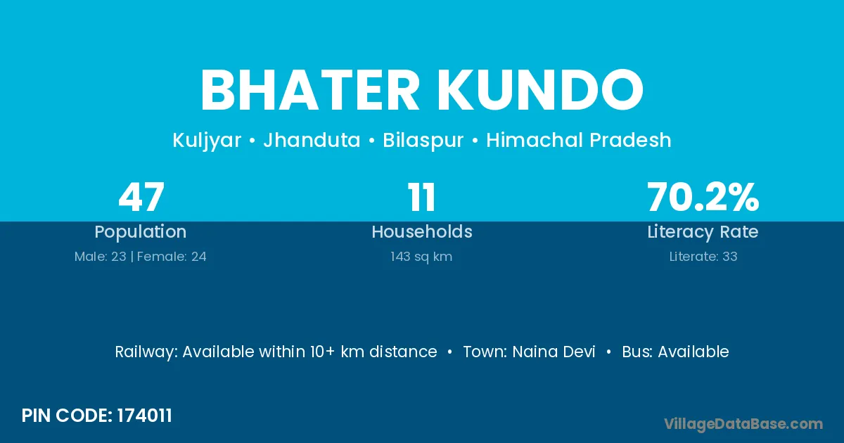 Bhater Kundo village has a total population of 47 people, of which 23 are males and 24 are females.
