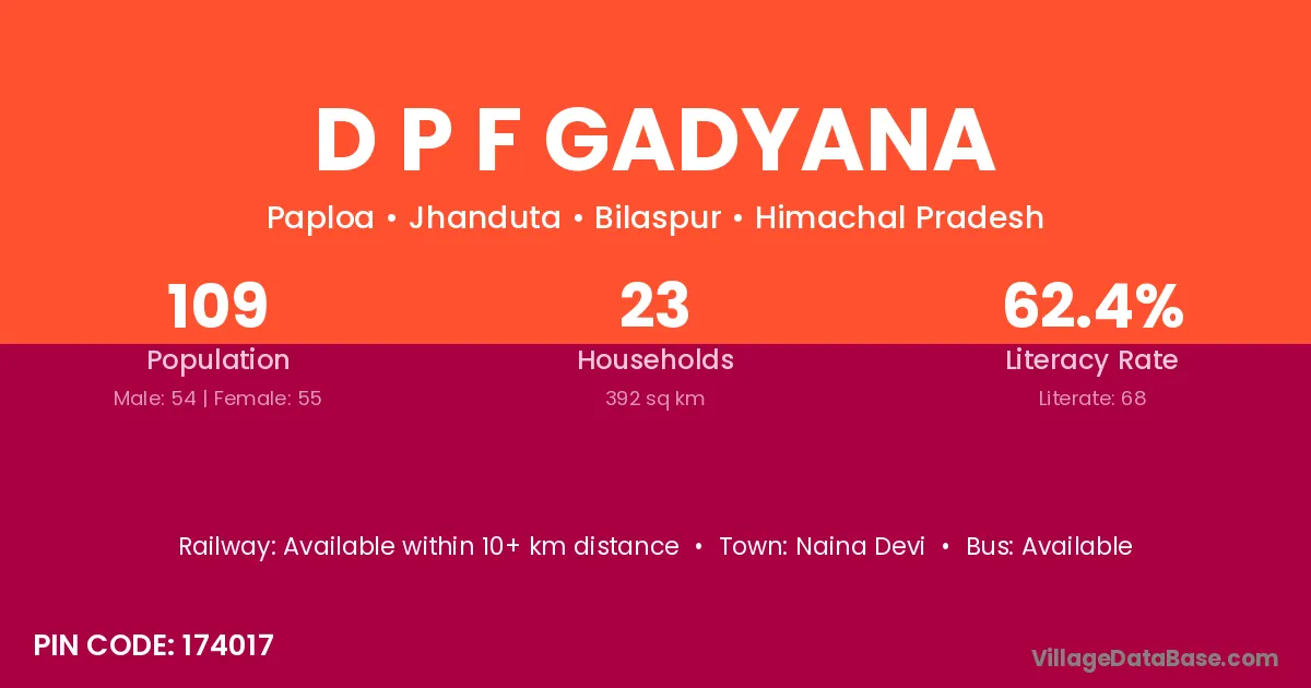 D P F Gadyana village is located in the Jhanduta Tehsil of the Bilaspur district in Himachal Pradesh .