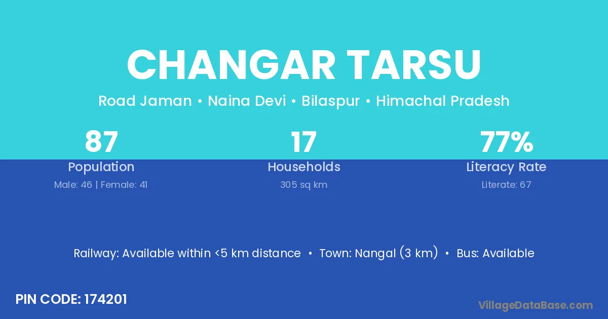 Changar Tarsu village has a total population of 87 people, of which 46 are males and 41 are females.