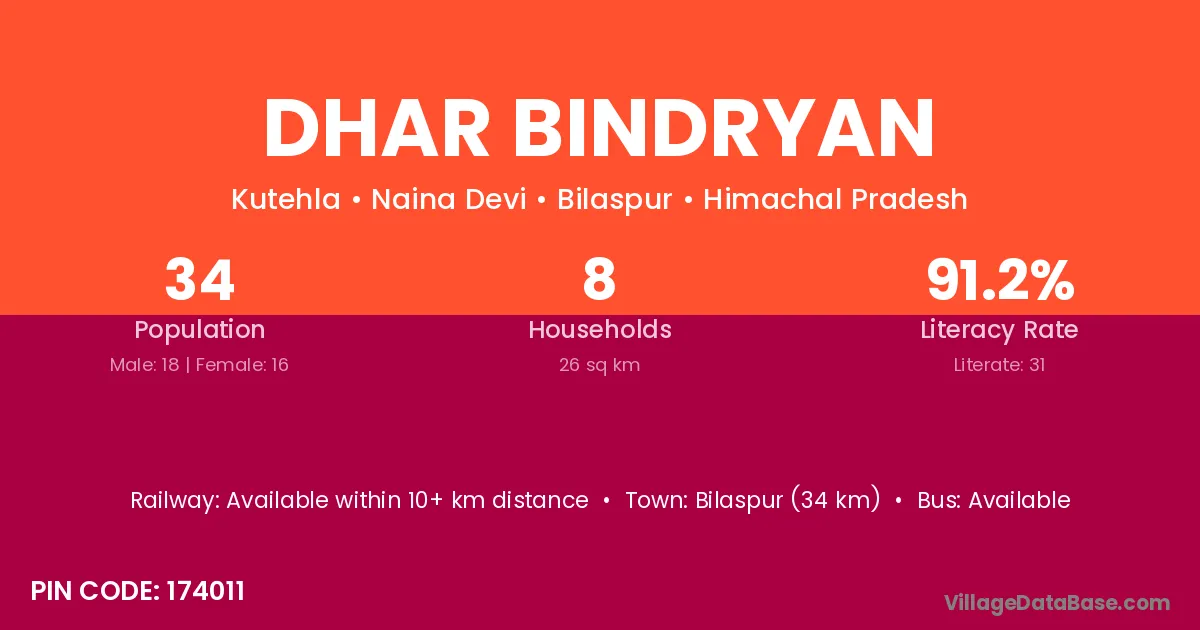 Bilaspur (34 km) is the nearest town to Dhar Bindryan village for major economic activities and is located approximately 34 km away.
