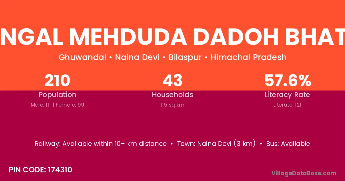 Naina Devi (3 km) is the nearest town to Jangal Mehduda Dadoh Bhater village for major economic activities and is located approximately 3 km away.