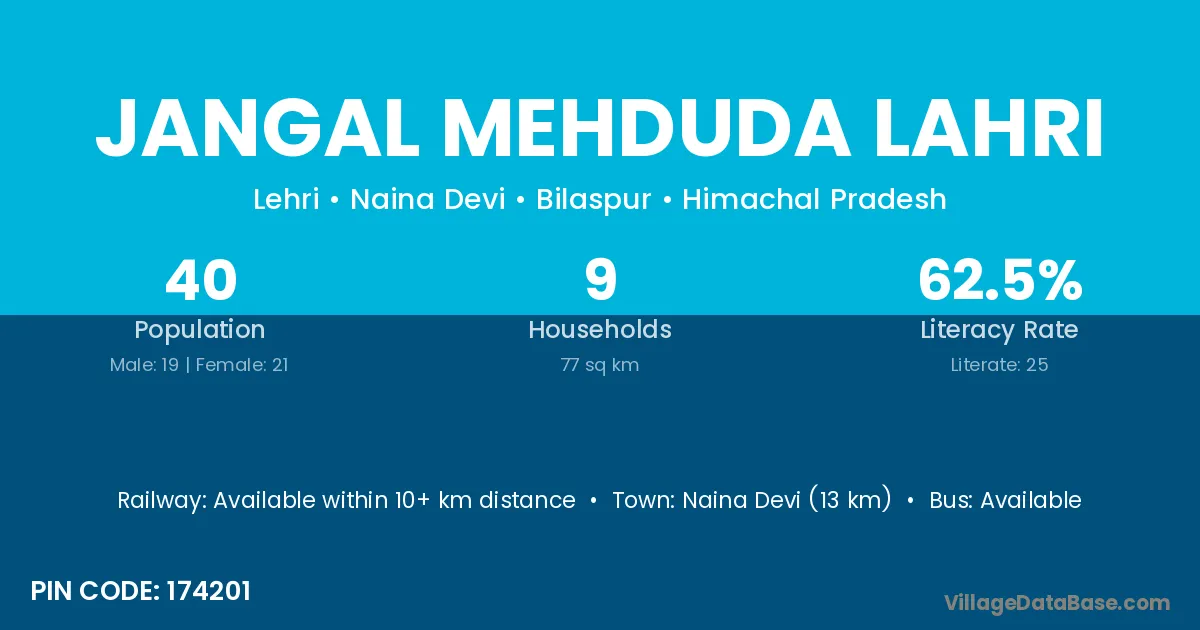 Naina Devi (13 km) is the nearest town to Jangal Mehduda Lahri village for major economic activities and is located approximately 13 km away.