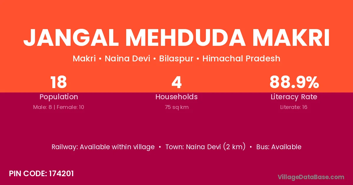 Jangal Mehduda Makri village has a total population of 18 people, of which 8 are males and 10 are females.