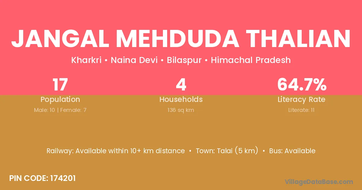 Jangal Mehduda Thalian village has a total population of 17 people, of which 10 are males and 7 are females.