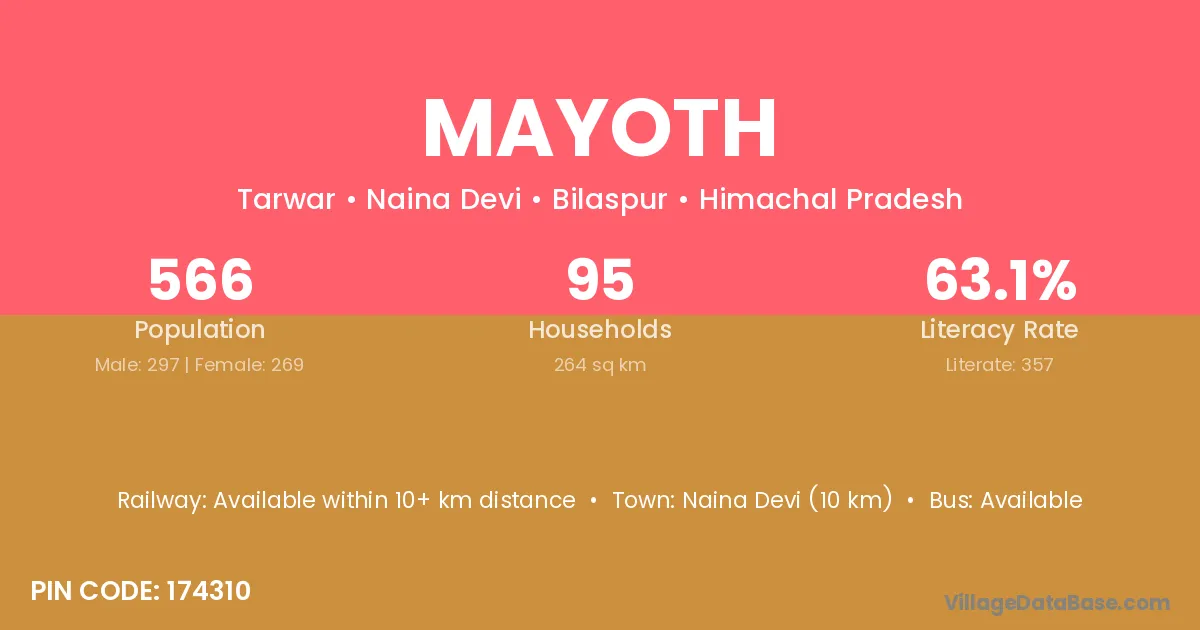 Naina Devi (10 km) is the nearest town to Mayoth village for major economic activities and is located approximately 10 km away.