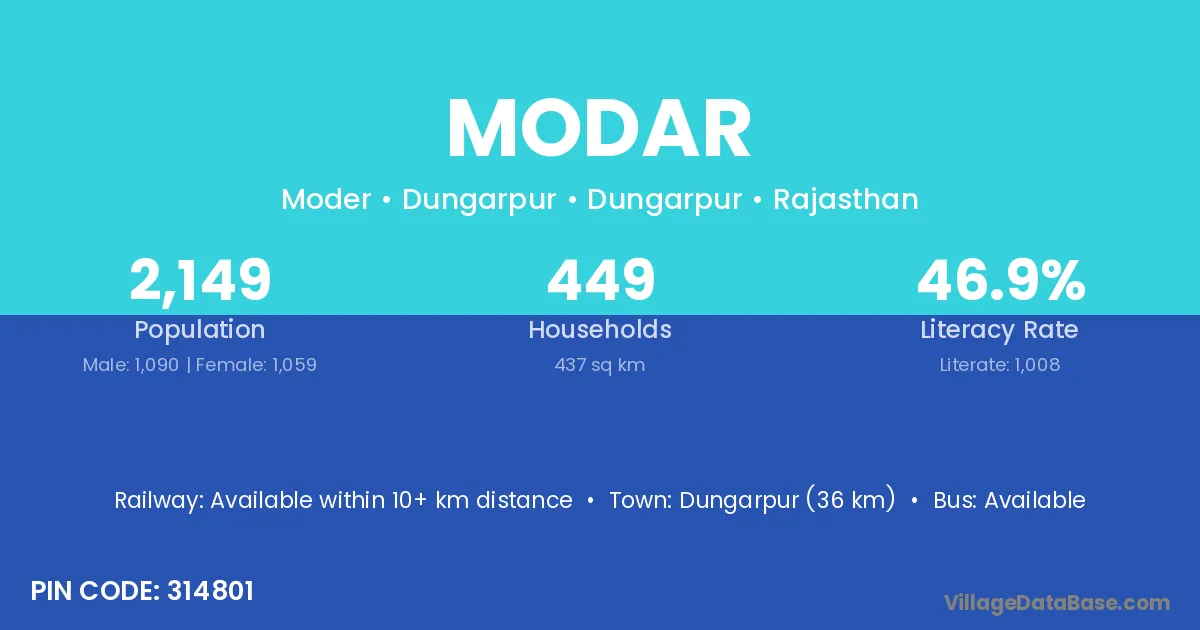 The literacy rate of Modar village is 56.25%. Male literacy stands at 53.85% and female literacy at 58.73%.