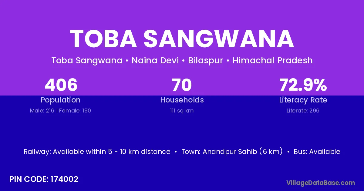 Anandpur Sahib (6 km) is the nearest town to Toba Sangwana village for major economic activities and is located approximately 6 km away.