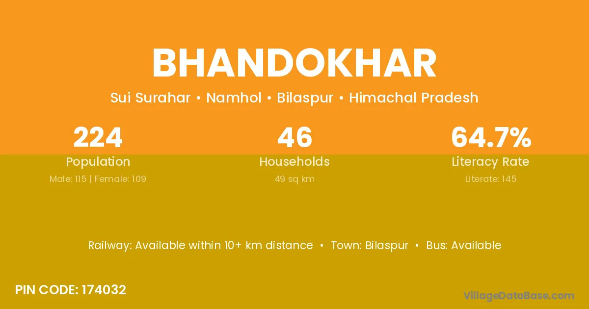 Bhandokhar village has a total population of 224 people, of which 115 are males and 109 are females.