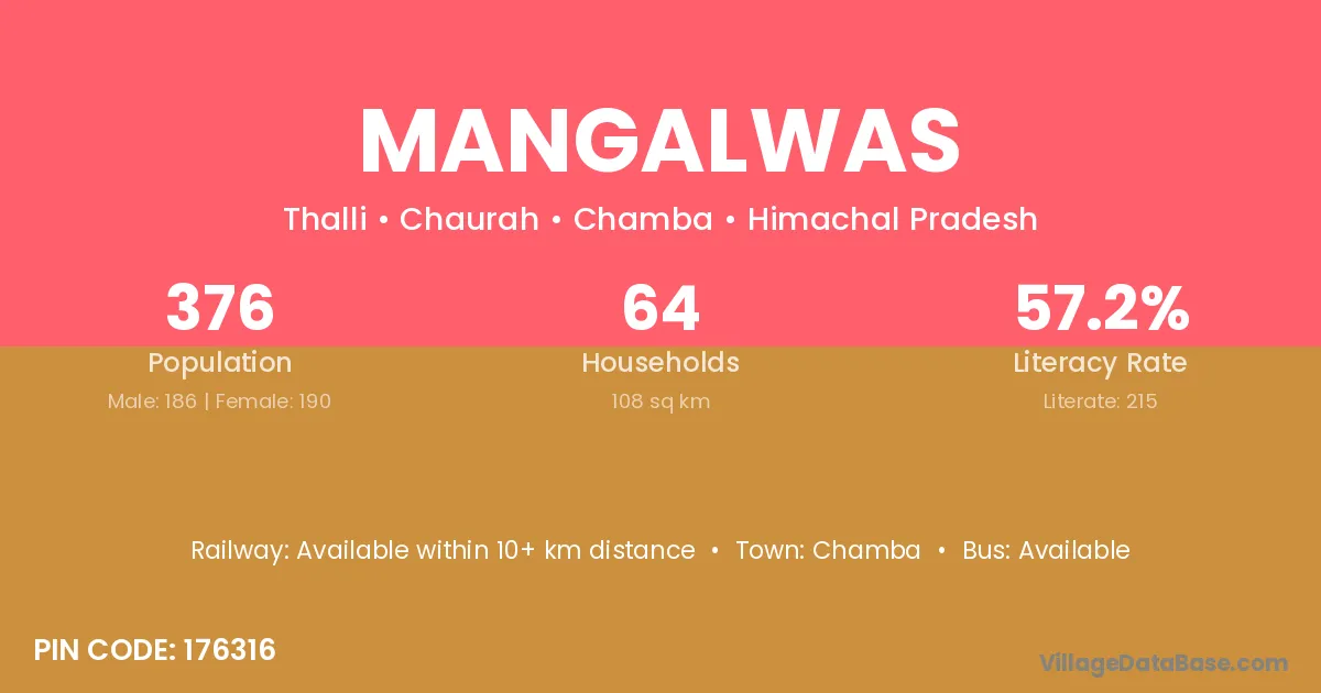 Mangalwas village has a total population of 376 people, of which 186 are males and 190 are females.