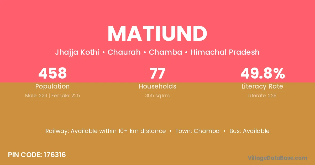 Matiund village has a total population of 458 people, of which 233 are males and 225 are females.