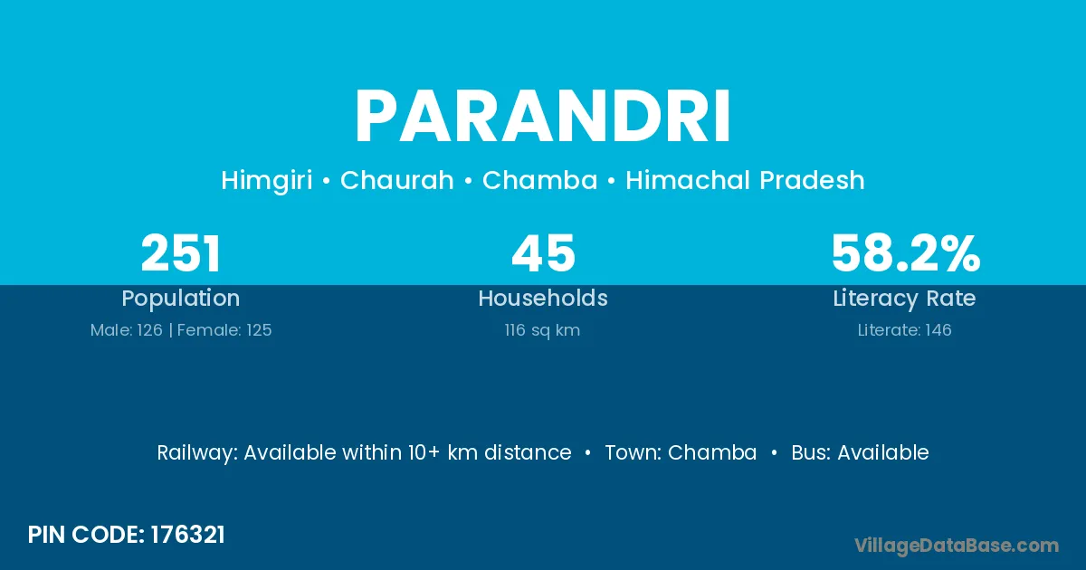 Parandri village has a total population of 251 people, of which 126 are males and 125 are females.