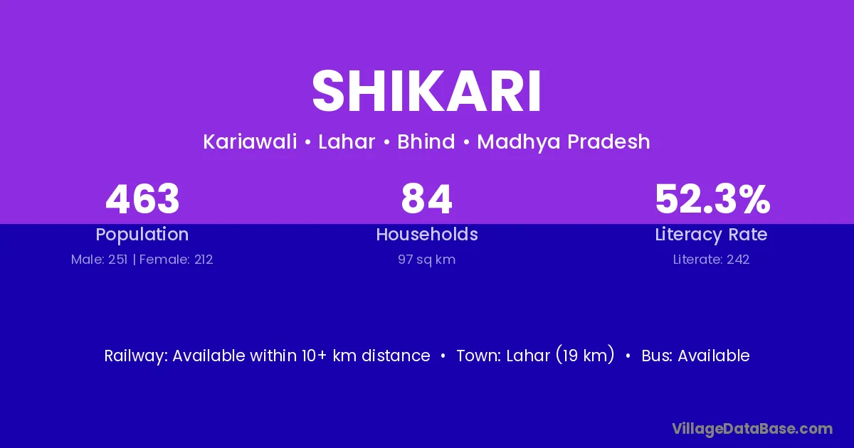 The literacy rate of Shikari village is 54.05%. Male literacy stands at 65.74% and female literacy at 42.90%.