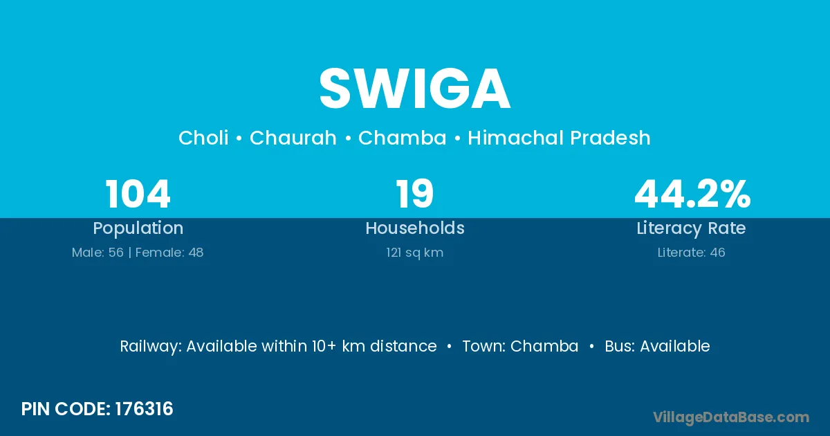 The literacy rate of Swiga village is 44.23%. Male literacy stands at 62.50% and female literacy at 22.92%.