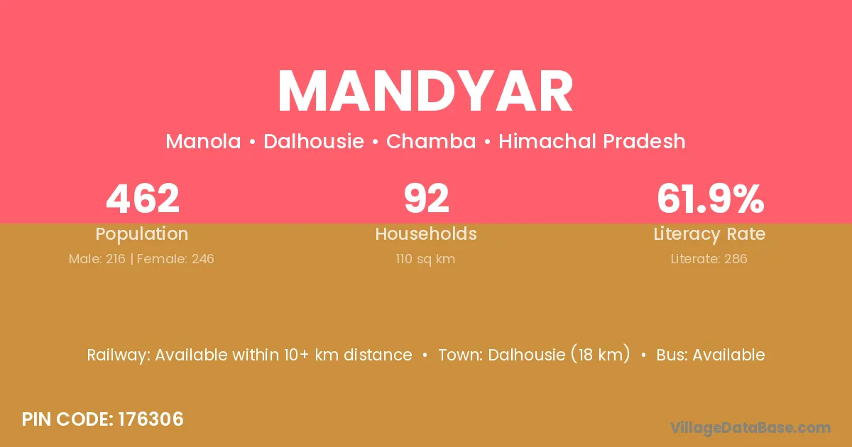 Dalhousie (18 km) is the nearest town to Mandyar village for major economic activities and is located approximately 18 km away.