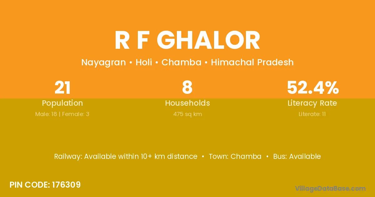 R F Ghalor village has a total population of 21 people, of which 18 are males and 3 are females.