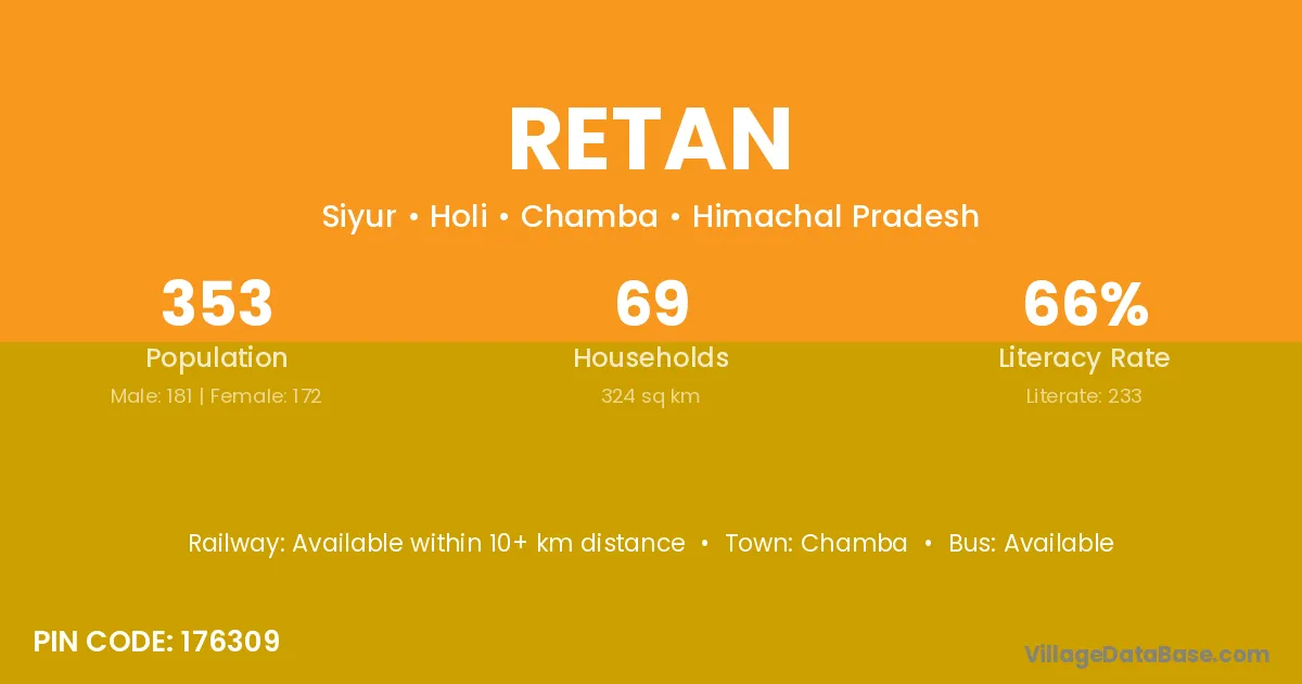 Retan village has a total population of 353 people, of which 181 are males and 172 are females.