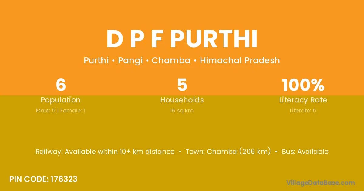 D P F Purthi village has a total population of 6 people, of which 5 are males and 1 are females.