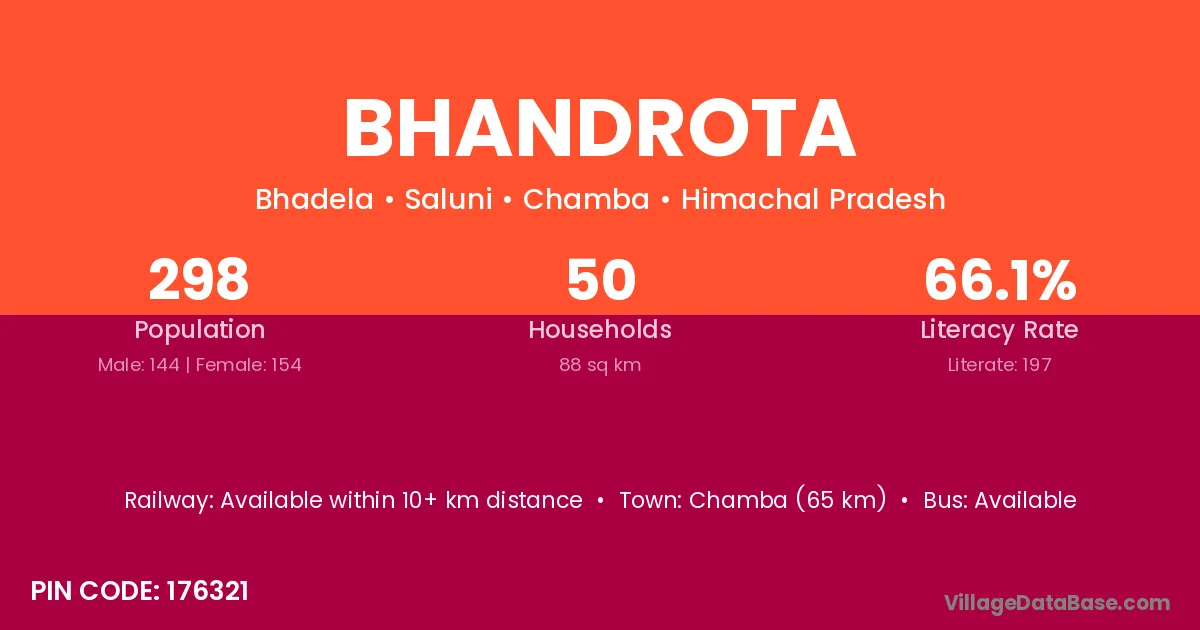Chamba (65 km) is the nearest town to Bhandrota village for major economic activities and is located approximately 65 km away.