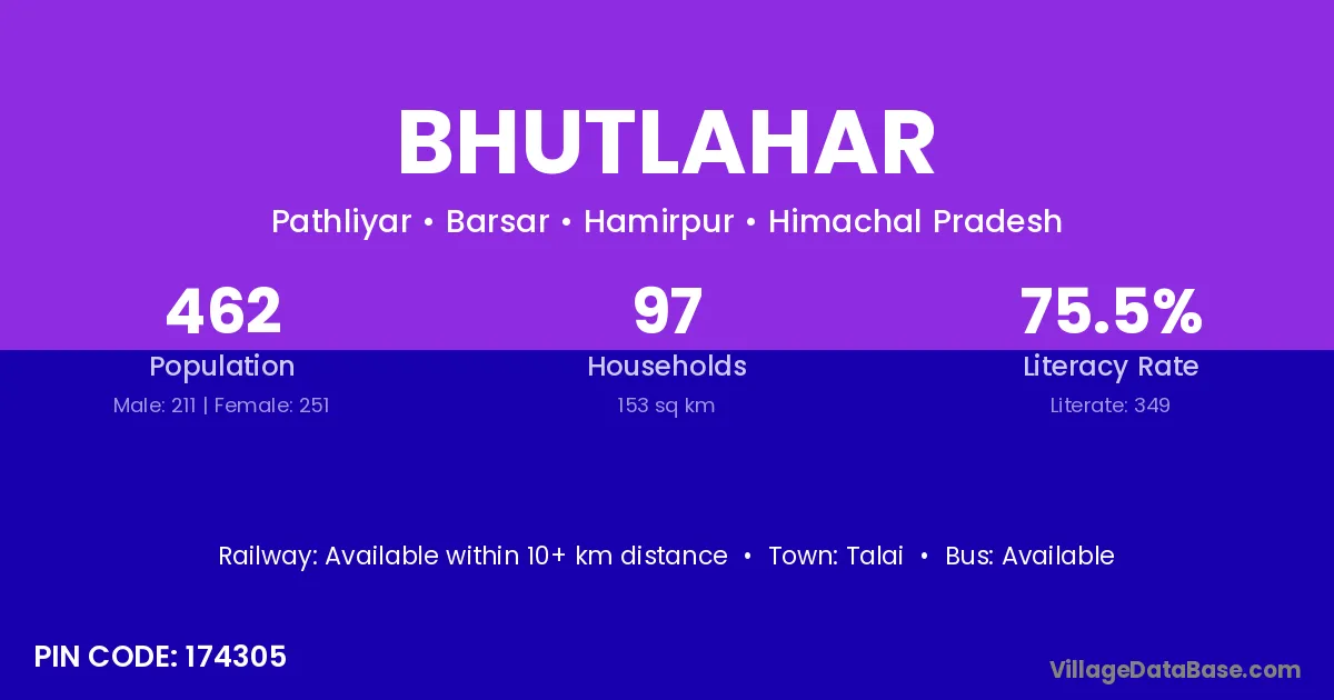 Bhutlahar village has a total population of 462 people, of which 211 are males and 251 are females.