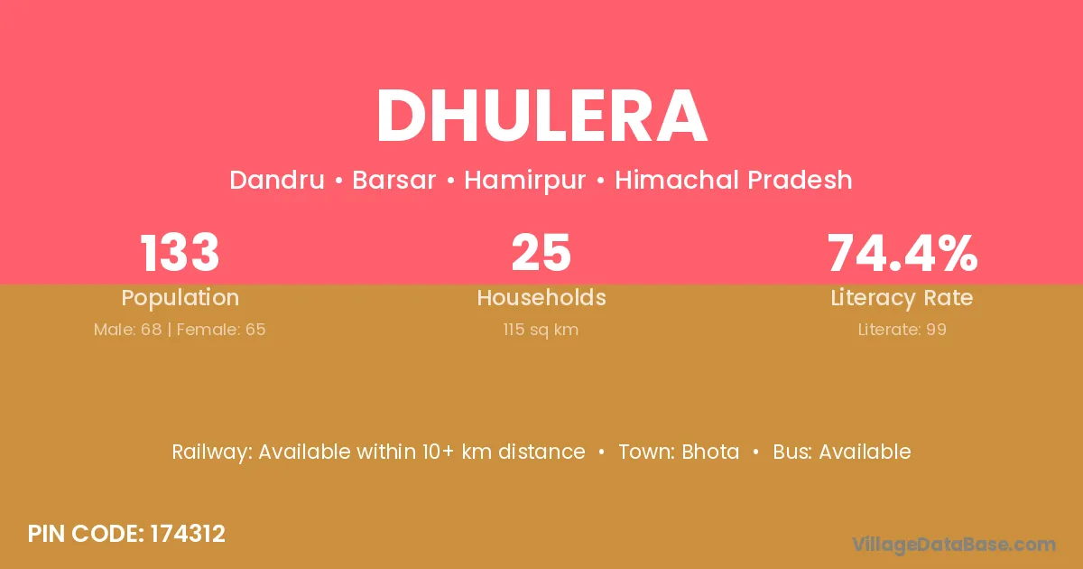 Dhulera village has a total population of 133 people, of which 68 are males and 65 are females.