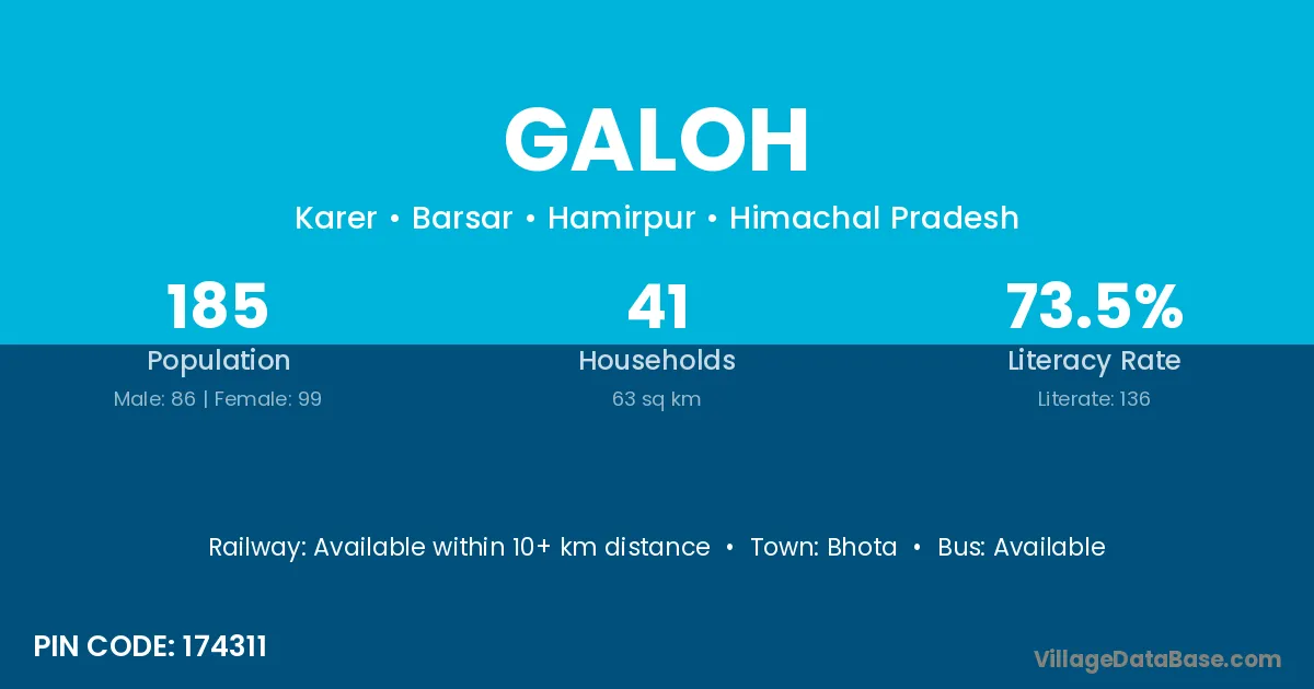 The literacy rate of Galoh village is 73.51%. Male literacy stands at 77.91% and female literacy at 69.70%.