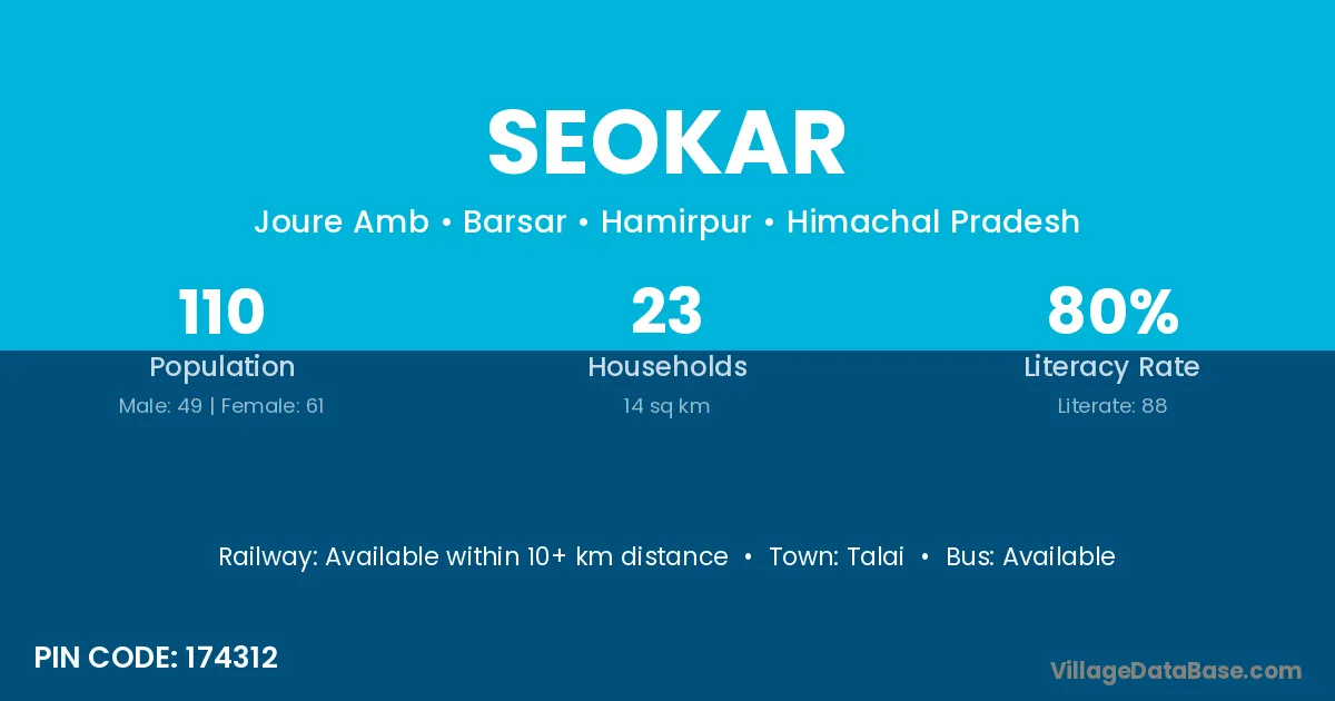 Seokar village has a total population of 110 people, of which 49 are males and 61 are females.