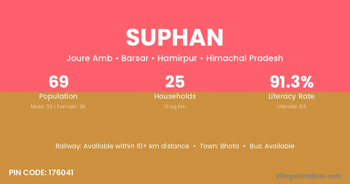 Suphan village has a total population of 69 people, of which 33 are males and 36 are females.