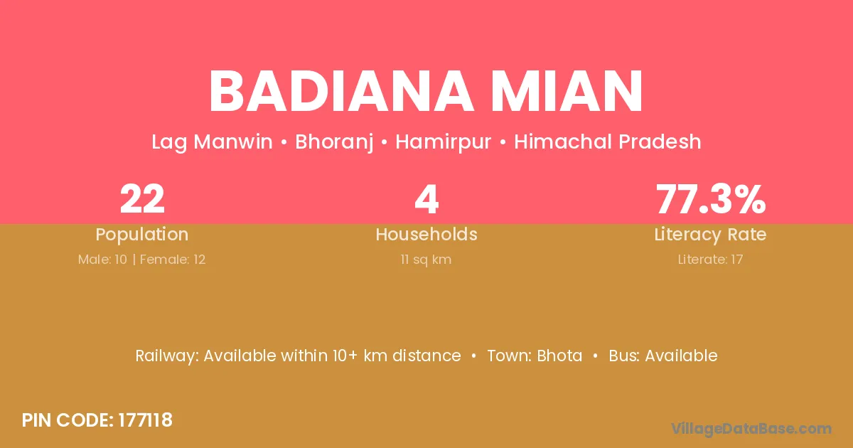 Badiana Mian village has a total population of 22 people, of which 10 are males and 12 are females.
